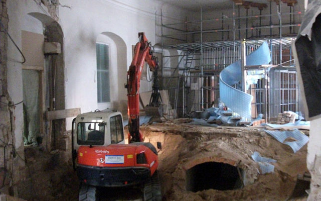Umbau mit bis zu sechs Meter tiefen Unterfangungskörpern im Bestand, Umbau und Sanierungsarbeiten der historischen Bausubstanz.
