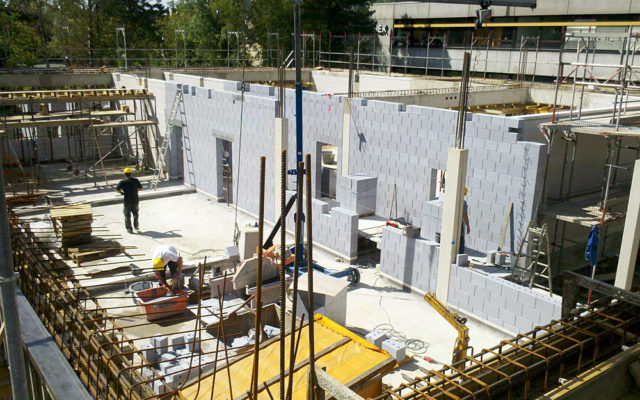 Sichtmauerwerk aus Fasensteine in grau mit gefärbtem Mörtel, 1500 m² mit Sichtbetonstürzen und Unterzügen, inkl. Vorbereitung von In-Wand-Verlegung von E-Leitungen, Umbau im Bestand der Schule mit Grundleitungen TML und KML Rohre aus Guss, Einbau Bodenplatten, Decken usw.