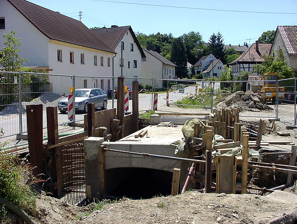 Sanierung des historischen Ortskerns, gestockte Sichtbetonoberflächen der Brückenbauwerke und Einbau verschiedenfarbiges Pflaster im Ortskern im wilden Reihenverband in Schneckenverlegung